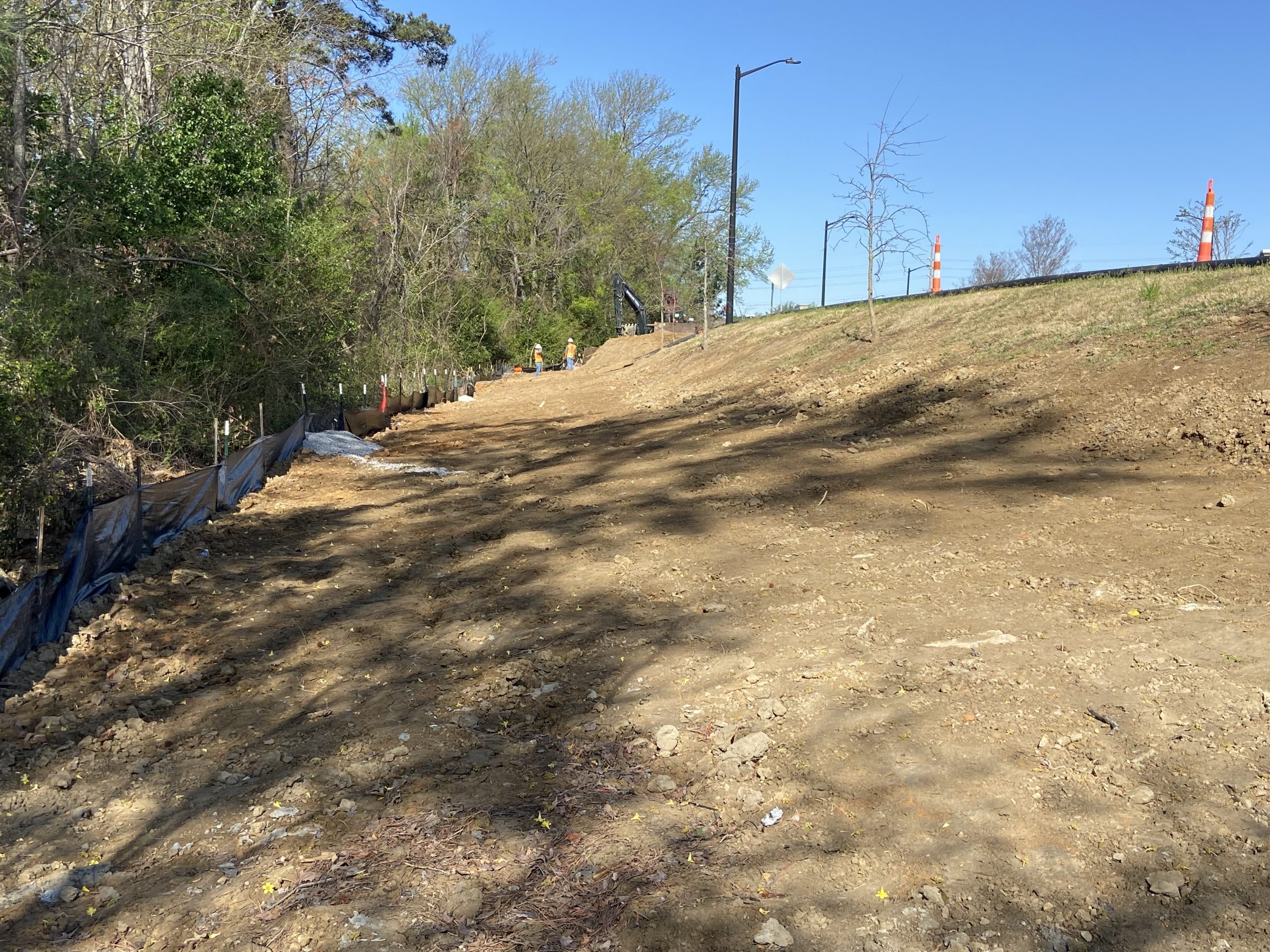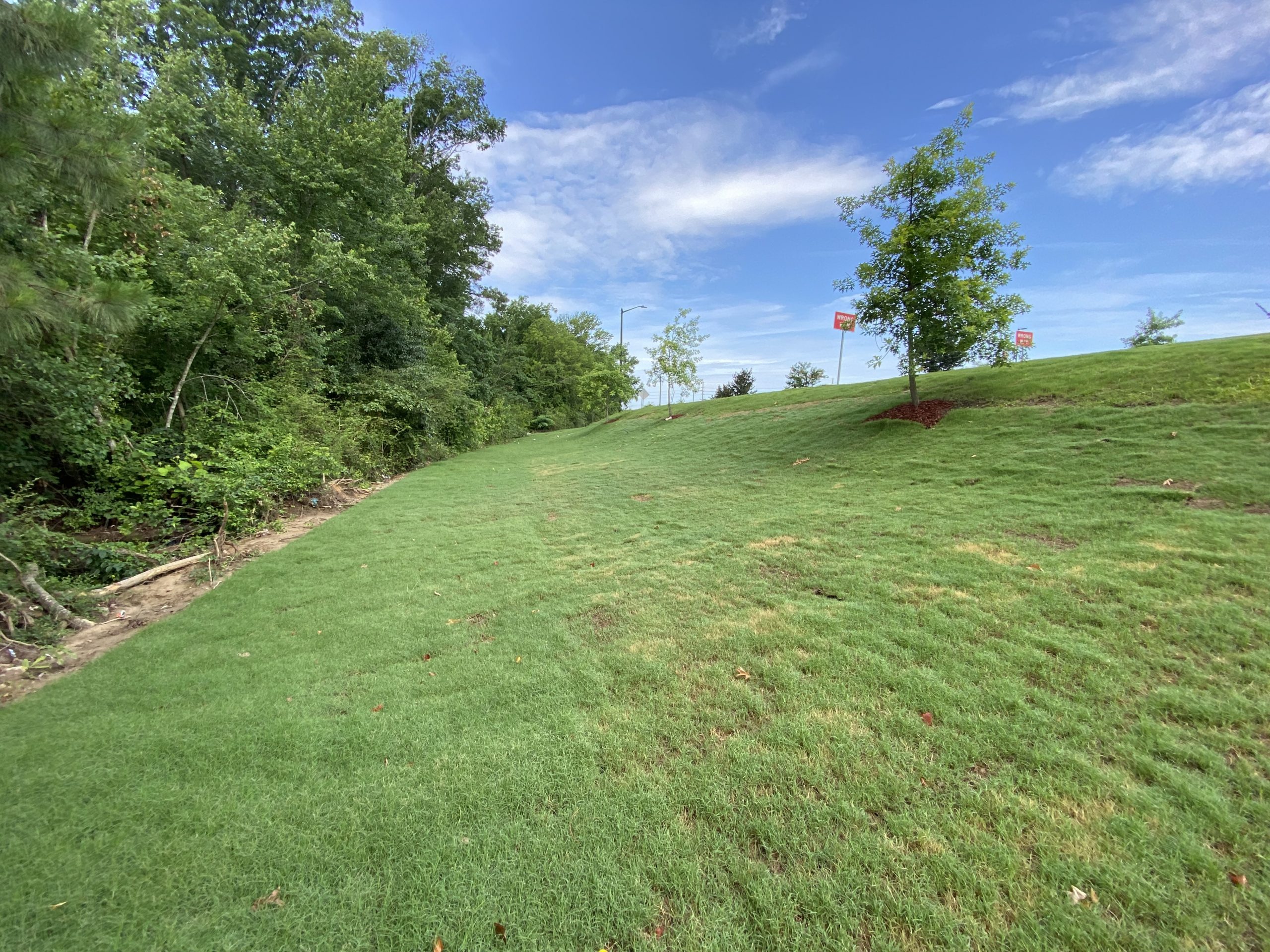 During construction, areas around a pond or stormwater device can become disturbed by the machines working in the area. In this case, the backside of this pond dam was bare from being freshly graded to meet specifications. To prevent future erosion and to stabilize the area after the job was completed our client opted to sod the bare areas.