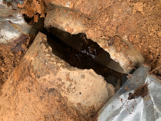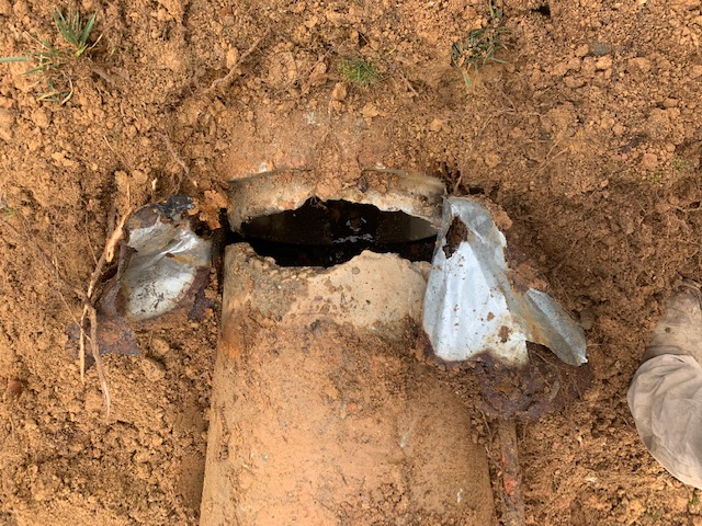 Our team recently repaired a pipe separation at the inlet pipe to a community stormwater pond. Repairs like these are common when the ground around an inlet pipe settles. Over time the flared end section (FES) of the pipe pulls away or separates from the other pieces of pipe. When this happens stormwater no longer discharges properly across the FES and into the inlet dissipater. Left unchecked separations like this can create erosion issues such as sinkholes, erosion rills, and undercutting of the dissipater. This will eventually lead to sediment deposits in the pond that will have to be removed later.