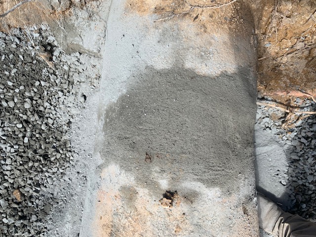 We pull the FES away from the piping to repair these separations and reestablish grade. The area is tightly compacted to discourage future settling. Then, if possible, the FES is reused or replaced. In this case, we reused the existing FES saving the client some cost in the project. The seal where the two pipes meet is sealed with a product called ConSeal. This seals the inside of the pipe and prevents water from bypassing out and around the pipe. To go the extra mile on this project we also poured a concrete collar around the pipe for extra sealing effect and to further stabilize the repair.
