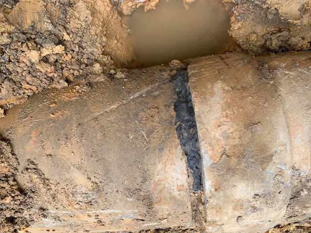 In this project, pictured below, the compromise was two separated joints in the RCP outlet pipe. These pipes are installed in sections and sometimes they can settle overtime which results in the connections between pipes becoming loose. The fix is to excavate down to the pipes and establish the connection so there are no longer voids or compromises. In this case we poured a concrete collar around the repaired areas for extra stability. Finally, the area is put back together and stabilized with seed and straw.