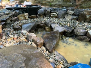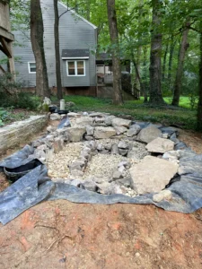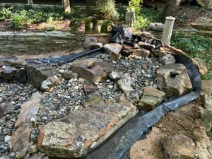 Our team started by carefully digging out the outline of the pond, shaping it to fit seamlessly within the existing landscape. Once the excavation was complete, we laid down a durable pond liner to provide a secure foundation. The liner was then covered with a series of stones, each chosen for its specific purpose and aesthetic appeal.