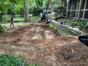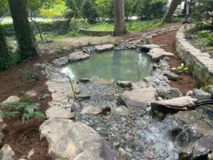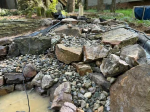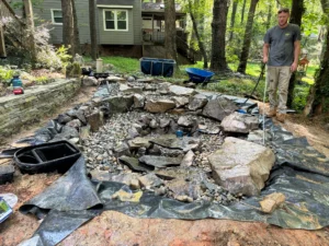 At Triangle Pond Management, we’re passionate about turning ordinary backyards into extraordinary retreats. One of our recent pond design and construction projects involved transforming an unused space bordered by an existing rock wall into a stunning backyard pond, complete with a serene water feature.
