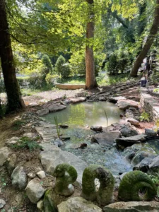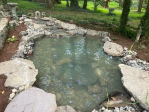 To keep the pond water clean and healthy, we installed a pond pump, filter, and aeration device. These essential components ensure that the water circulates properly, preventing stagnation and promoting a balanced ecosystem. While the water was initially cloudy as dirt and sediment washed off the stones, it gradually cleared, revealing the beautiful stonework beneath.