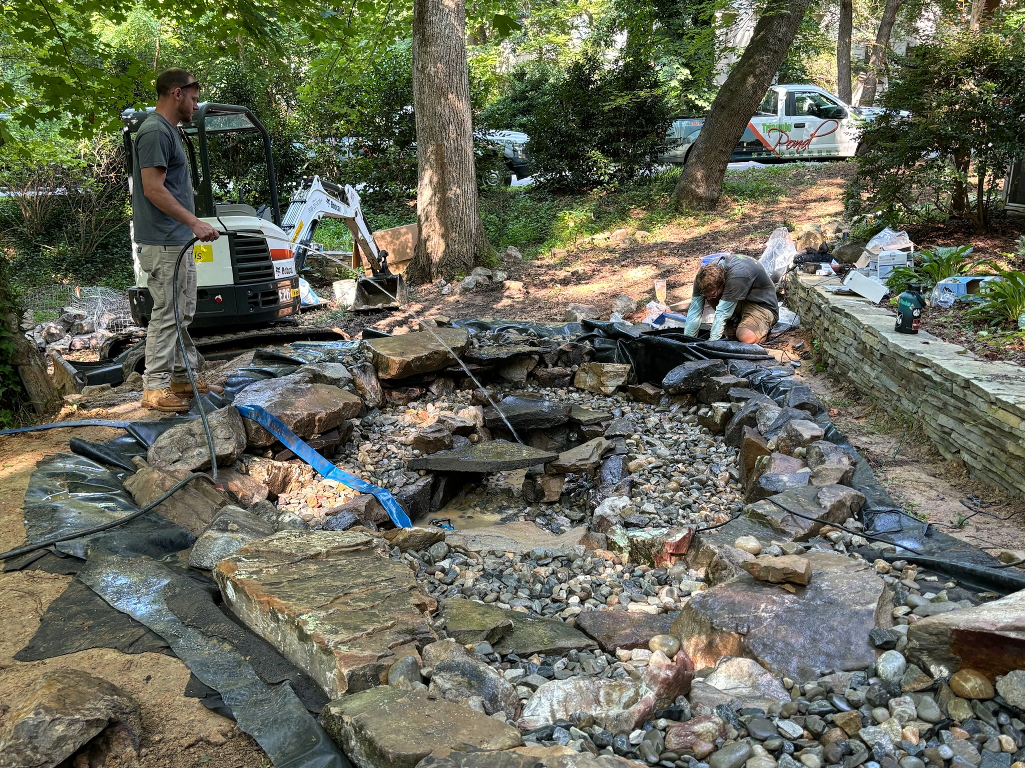 At Triangle Pond Management, we’re passionate about turning ordinary backyards into extraordinary retreats. One of our recent pond design and construction projects involved transforming an unused space bordered by an existing rock wall into a stunning backyard pond, complete with a serene water feature.
